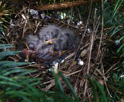 After nestlings are 5 days old, they defecate on the edges, creating a filthy mess, in a halo or wreath effect. |
